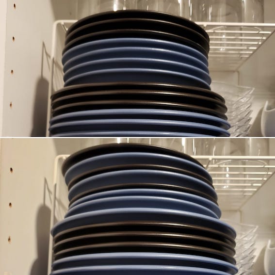 Ever since I’ve had them, when I put my dishes away, I always stack the blue ones together and the black ones together. It doesn’t matter if the blue ones are on top or the black ones, as long as the same-coloured ones are together. This is organized and proper. It’s how I can see order in my cupboard. It irks me if they are mismatched or out of order, because that’s not the way it’s supposed to be.